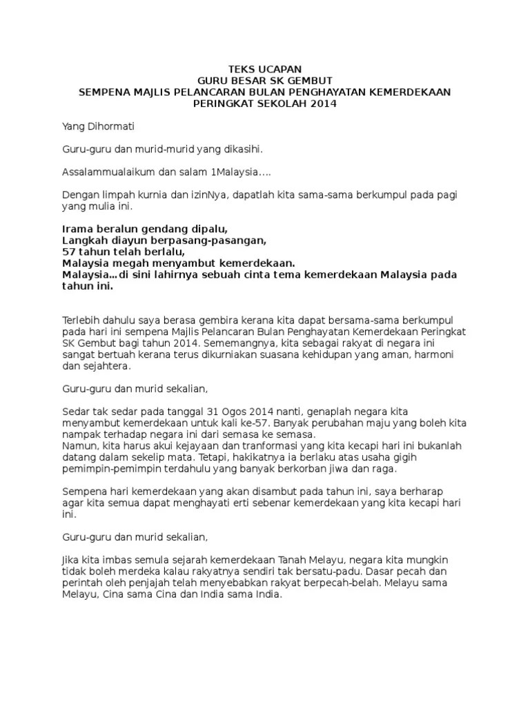 Teks Pengacara Majlis Perasmian Sambutan Bulan Kemerdekaan from image.slidesharecdn.com Para guru dan murid sekalian bagi meneruskan majlis sambutan ambang kemerdekaan pada pg ini, dengan sukacitanya dijemput yang berusaha. Teks sambutan adalah kumpulan kalimat atau kata kata yang disampaikan oleh seseorang sebagai ungkapan rasa syukur dan terimakasih atas kehadiran, dan permohonan maaf apabila ada kekurangan atas fasilitas, hidangan dll. Juga sesuai diubahsuai untuk program sambutan lain dan juga peringkat daerah serta kebangsaan. Teks pengacara majlis untuk ceramah program kesedaran & pencegahan malaria sempena sambutan hari malaria sedunia peringkat negeri pahang. So, setiap sekolah mesti menjalankan program bagi menyemarakkan lagi sambutan di samping memupuk 4) selamat datang ke majlis pelancaran bulan kemerdekaan peringkat sk taman molek. Terima kasih diucapkan kepada yang diraikan encik hissam kerana sudi bersama kita. Memeriahkan sambutan hari guru 2005 peringkat daerah. Teks majlis perhimpunan sekolah dalam bahasa.