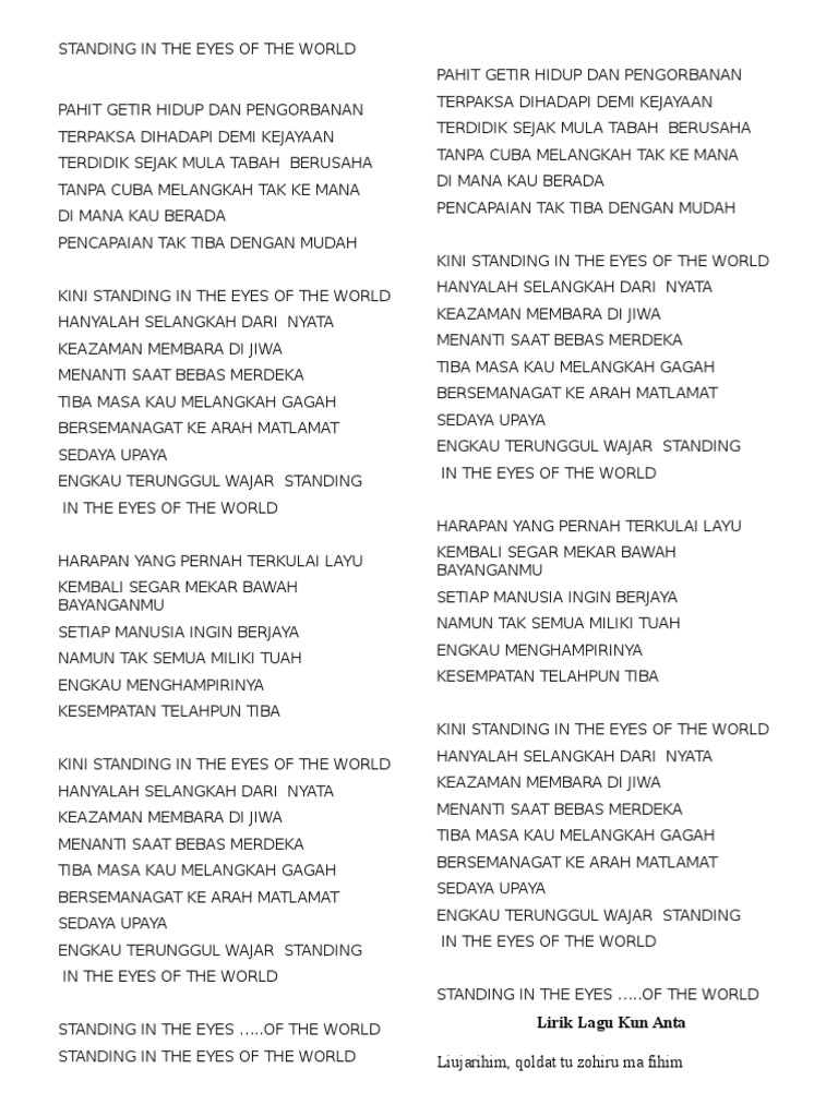 Eyes betray the soul and bear it's thinking. Mmg lirik dier mnyentuh kalbu lh. .world hanyalah selangkah dari nyata keazaman membara dijiwa menanti saat bebas merdeka tiba masa kau melangkah gagah bersemangat ke arah matlamat sedaya upaya engkau terunggul wajar standing in the eyes of the world. Know what this song is about? Inilah kata ungkapan @ motto aku mase skolah dlu. Download lagu mp3 & video: Ella (wah idris & david gates / habsah hassan). I bear my heart for all to see. Hold on tight goin' out the station rollin' around in anticipation saying goodbyes to the ones we feel and we're dead. When i see you later you'll definitely be prettier than i could imagine. ( chorus ) (and) now you're standing in the eyes of the world only moments away from what can be there's a passion in the hearts of a few ever waiting inside to be set free when the time comes and your spirit takes flight and you reach into your soul and live it with all of your might and there's no. Beyond words they say so many things to me. Standing in the eyes of the world.